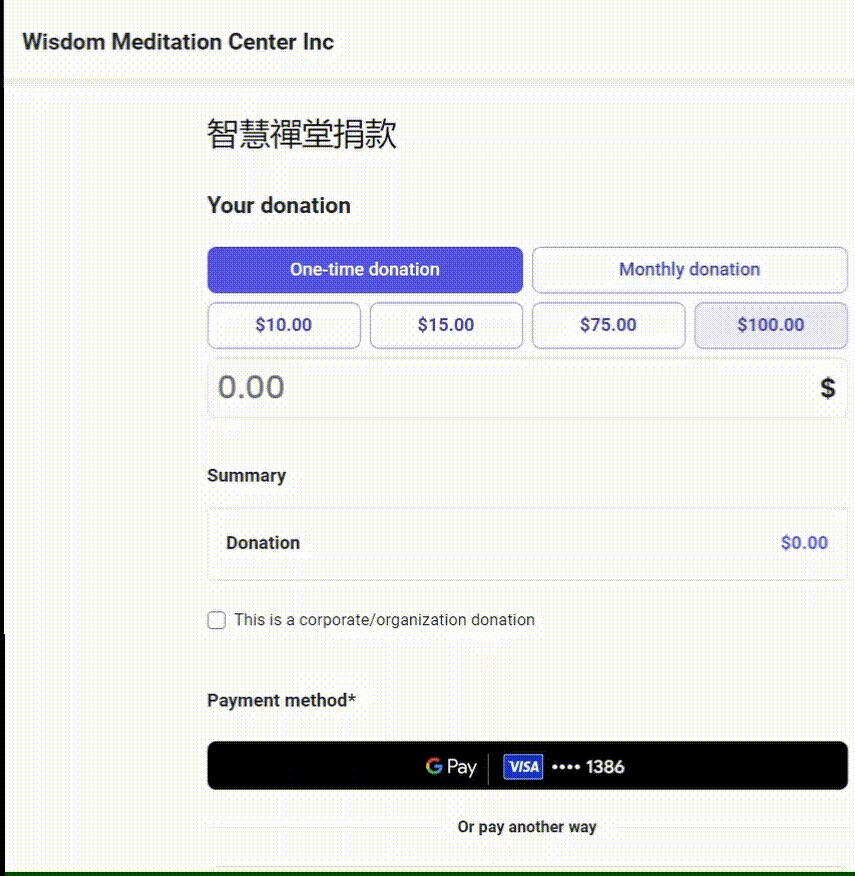此自動附加的17%付款用於zeffy平臺的開發維護,與智慧禪堂無關。正確填寫email地址,此付款表格可自動發出收據。確定最後的Total金額是您的捐款金額,名字電郵正確,最後點擊Donate。
